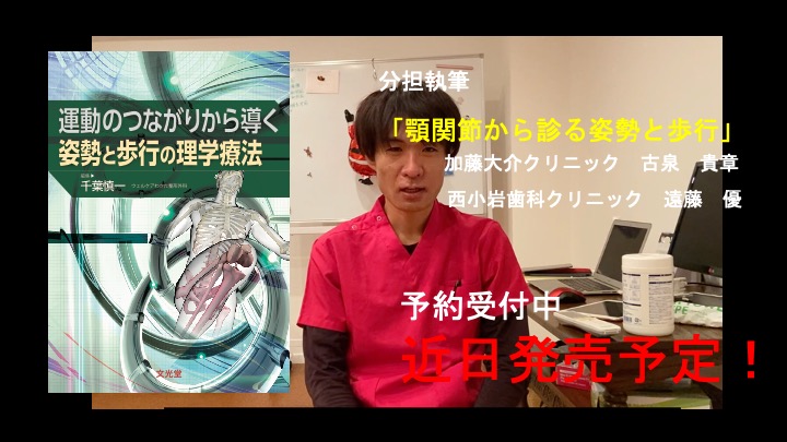 本のタイトルは「運動のつながりから導く姿勢と歩行の理学療法」です。私は顎関節から診る姿勢と歩行というテーマで、西小岩歯科クリニックの遠藤優先生と共同執筆させていただきました。