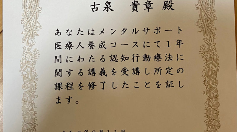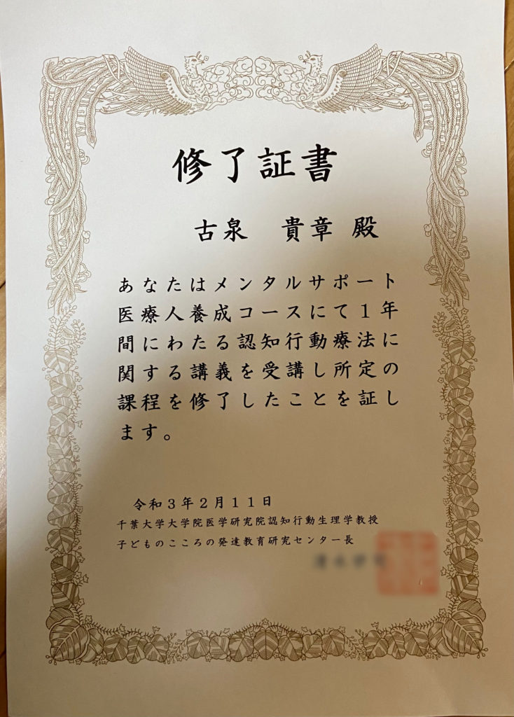 先日、1年間受講していた千葉大学大学院医学研究院の認知行動療法学講座から修了書が自宅に届いていました。